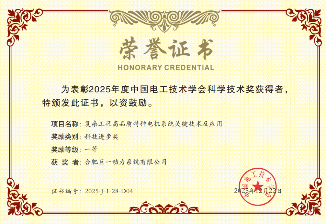 巨一動力斬獲中國電工技術學會科技進步一等獎
